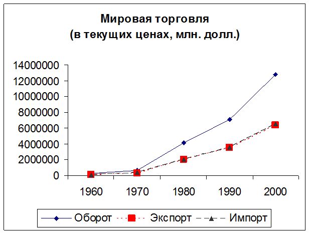 Общий экспорт увеличился с более чем 313 млрд. долл. В 1970 г. до почти 3,45 трлн. долл. В 1990 г. и 6,45 трлн. долл. В 2002 г.[1] Импорт за эти годы возрос с 328 млрд. до 3,6 трлн. долл. В 1990 и 6,5 трлн. долл. В 2000 г.[2] В период 1950 – 1994 гг. мировое производство возросло в 5,5 раз (ежегодно увеличиваясь на 4%), мировой торговый оборот вырос в 14 раз (ежегодный рост на 6%). Решающее влияние на развитие международной торговли оказывают структурные сдвиги и циклические колебания мирового хозяйства. Спад производства в мире (1992 – 1993 гг.) повлек за собой спад объемов мировой торговли. На мировом рынке усиливается наступление стран Юго-Восточной Азии – Индонезии, Филиппин, Малайзии, Таиланда. Укрепляются позиции Индии и Китая. Растет торговля между развивающимися странами. Азия усиливает свои позиции (без Японии) не только на традиционных рынках (текстиль, простая потребительская продукция), но и на рынках сложных изделий.