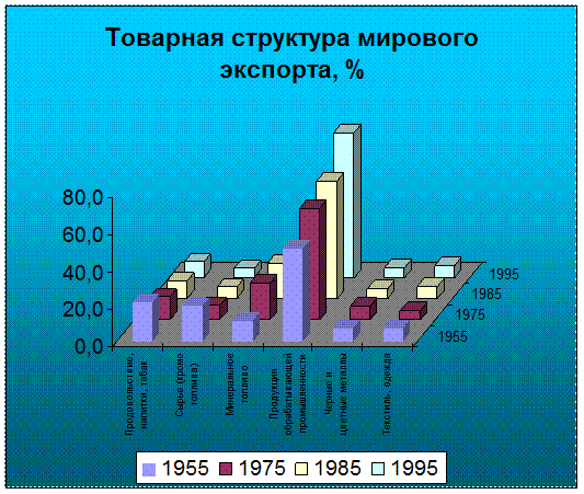 Согласно последним оценкам, в 1955-1994 гг. произошло резкое снижение в мировом экспорте удельного веса сельскохозяйственных товаров — с 34,9 до 11,9%, продукции добывающей промышленности — с 23,2 до 13,6%. Напротив, существенно повысилась доля готовых изделий с 40,9% в 1955 г. до 71,5% в 1994 г.