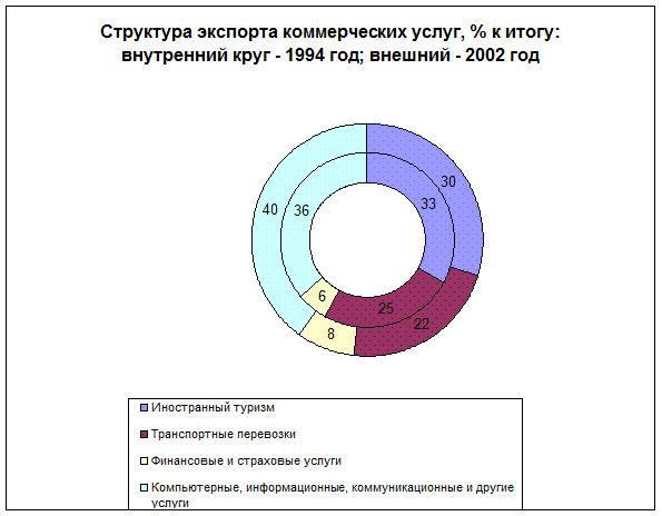 Как показывают данные Международного валютного фонда, общий объем услуг составляет около 25% общей величины мирового экспорта, причем в 1998 г. эта величина, по приблизительным подсчетам, еще увеличится. Услуги растут более высокими темпами по сравнению с внешней торговлей; для двукратного роста потребовалось всего лишь семь-восемь лет по сравнению с 15 годами, которые были необходимы для аналогичного увеличения объема экспорта товаров. Особенно быстро растет доля услуг, предоставляемых частными фирмами; за этот период она выросла в два с половиной раза.