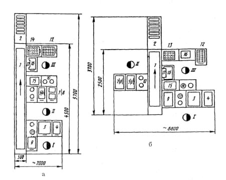 а — с односторонним расположением раздаточного оборудования ЛККО-1, б — с двусторонним расположением раздаточного оборудования ЛККО-2