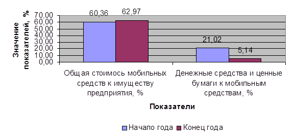 На основании данных рис. 2.5. видно, что на конец года незначительно увеличилась общая стоимость мобильных средств к имуществу предприятия. А денежные средства и ценные бумаги к мобильным средствам наоборот снизились, причем более сущесвенно, чем общая стоимость мобильных средств к имуществу предприяия.