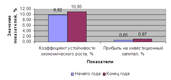 На основании данных рис. 2.8 видно, что на конец года увеличился коэффициент экономического роста, и прибыль на инвестиционный капиал. На конец года незначиельно снизилась оборачиваемость инвестиционного капитала, оборачиваемость оборотного капиала, а рентабельнось продукции осталась на прежнем уровне.