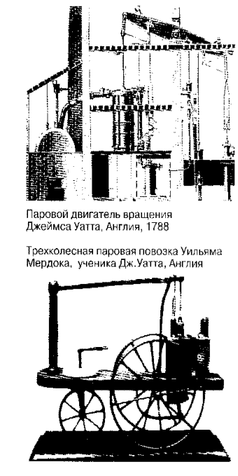 Начало промышленной революции также связывают с изобретением паровой машины. Паровой двигатель был изобретен Д. Уаттом в 1765 г. и сразу же получил широкое внедрение. Была создана паровая повозка, первый пароход, паровоз.