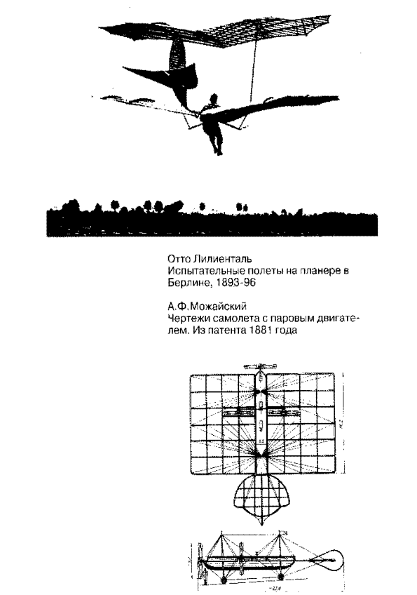 Первый в мире самолет с паровым двигателем был построен русским морским офицером А.Ф. Можайским. В 1878 г. им были разработаны чертежи, а в 1883 г. был построен самолет. Однако на испытаниях 1884 г. самолет ждала неудача: он отделился от земли, но, будучи неустойчивым, накренился набок и поломал крыло. Причина была в том, что самолет Можайского имел двигатель втрое меньшей мощности, чем требовалось для полета (рис. 6) [5].