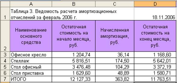 Рисунок 12. «Ведомость расчета амортизационных отчислений за март 2006г.»