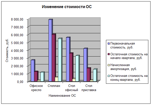 5. Результаты изменения первоначальной стоимости основных средств на конец квартала представить в графическом виде.