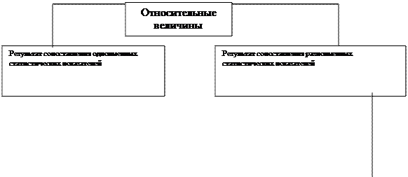 В результате соотношения одноименных показателей получают следующие относительные величины: относительные величины динамики; относительные величины выполнения плана и планового задания; относительные величины структуры; относительные величины координации; относительные величины наглядности.