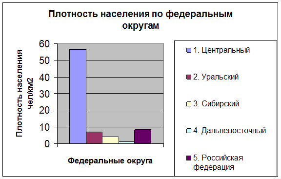1. Наибольшая плотность населения в Центральном федеральном округе (56,4 чел/км2), за ним следуют Уральский (7 чел/км2) и Сибирский (4 чел/км2) федеральные округа и на последнем месте Дальневосточный федеральный округ (1,1 чел/км2).