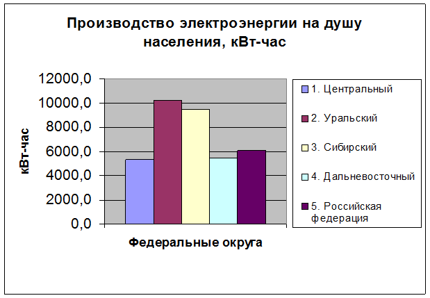 Из полученных данных определим, что наибольшее производство электроэнергии на душу населения приходится на Уральский федеральный округ (10214,3 кВт/час), за ним следуют Сибирский федеральный округ (9430 кВт/час), Дальневосточный федеральный округ (5464,8 кВт/час) и Центральный федеральный округ (5335,1 кВт/час).