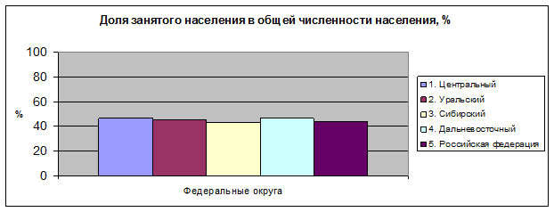 5. Наибольшая доля занятого населения в общей численности населения в Центральном (46,6%) и Дальневосточном федеральных округах (46,5%). Немного ниже идет Уральский федеральный округ (45,2%) и на последнем месте Сибирский федеральный округ (43%).