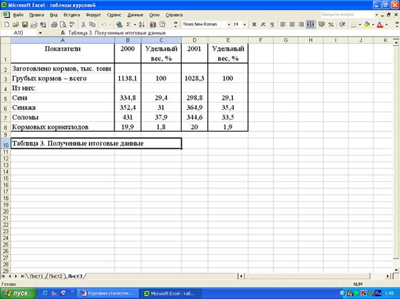 На основании полученных данных можно сделать вывод о том, что в 2001 году по сравнению с 2000 по ряду показателей наблюдается занижение значений, таких как сена, соломы, а значения сенажа и кормовых корнеплодов увеличились незначительно.