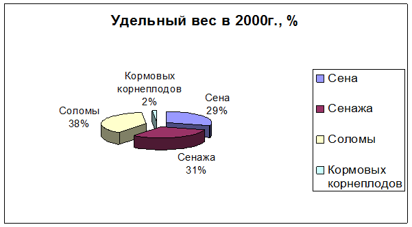 На основании рис.5 можно заключить, что наибольший удельный вес в структуре заготовленных кормов в 2000 году занимала солома (38%), затем сенаж – 31%, следом сено - 29% и кормовые корнеплоды имели очень низкое значение.
