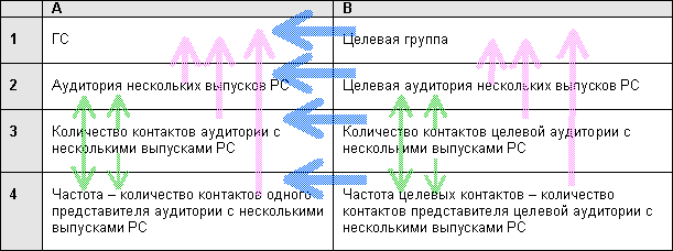 Между понятиями: "целевая аудитория", "количество целевых контактов", "частота целевых контактов" - существует такая же взаимосвязь, что и рассмотренная в пункте "ОТЛИЧИЕ 2". Там же рассмотрено деление по вертикали колонки А.