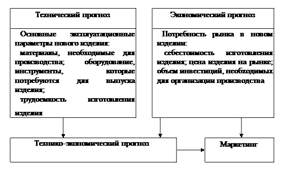 В отличие от экономического научно-технический прогноз определяет вероятное натурально-вещественное состояние прогнозируемого объекта. Взаимосвязь экономического и технического прогнозирования выглядит следующим образом. Вначале разрабатываются технические прогнозы, непосредственно связанные с объектом экономического прогнозирования, выявляются и конкретизируются потребности рынка в нововведениях, которые являются составной частью рыночной конъюнктуры. Эти прогнозы могут увязываться с задачами повышения качества продукции, снижения ее себестоимости или, например, с возможностью увеличения объема производства. Исходя из конкретных потребностей рынка разрабатываются прогнозы, описывающие область сбыта продукции и возможные методы (технология, организация) производства и развития самого объекта прогнозирования (рис. ).