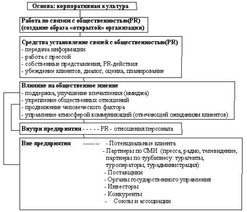 “Задача PR состоит в том, чтобы наладить взаимопонимание, положительное отношение и доверие клиента к предложению предприятия гостинично- туристского бизнеса на длительную перспективу. Речь идет о формирование в глазах общественности положительного имиджа, хорошей репутации и уважения к предприятию.”(4)