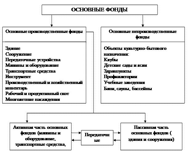 Прогрессивность структуры основных фондов характеризует удельный вес их активной части. Обществу не безразлично, в какую группу основных фондов вкладываются средства. Оно заинтересовано в оптимальном повышении удельного веса машин и оборудования — активной части фондов (машины и оборудование), которые обслуживают решающие участки производства и характеризуют производственные возможности предприятия по выпуску тех или иных изделий. Здания, сооружения, инвентарь, обеспечивающие нормальное функционирование активных элементов основных фондов, относятся к пассивной части основных средств.