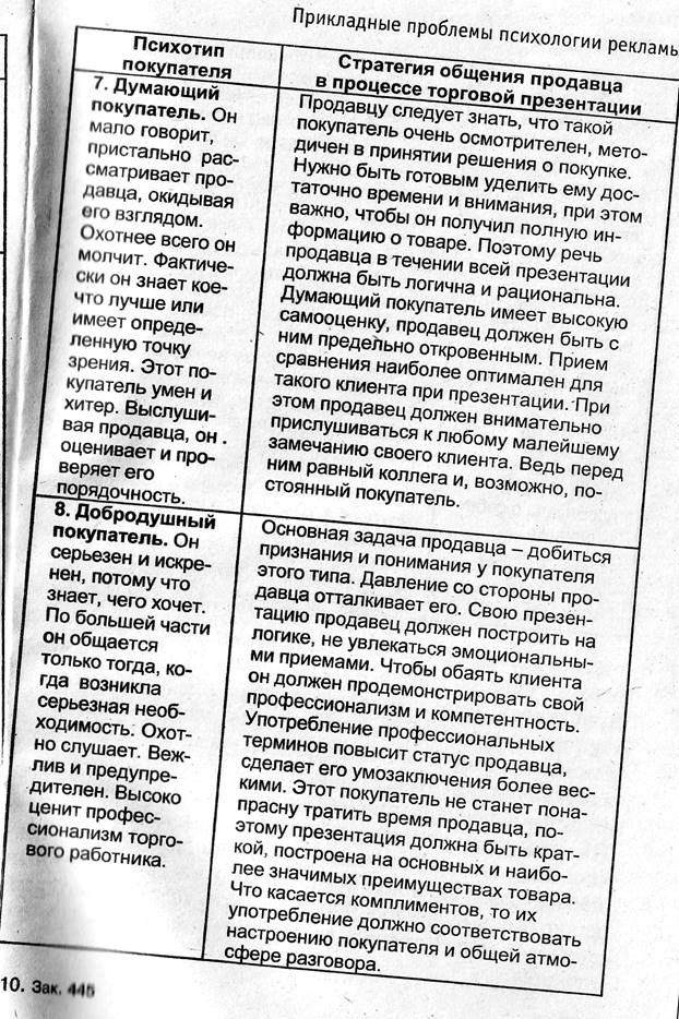 шить последний шаг в продвижении своего товара. В этом случае рассмотренные приемы будут не только привлекать, но и постоянно поддерживать внимание и интерес потенциального покупателя, усиливать его желание приобрести рекламируемый товар. При этом «навязчивая» презентация волшебным образом преобразится в приятное общение, обсуждение важной проблемы. Именно такая атмосфера будет максимальным образом способствовать заключению торговой сделки. На уровне подсознания покупатель любого из рассмотренных психотипов будет чувствовать: «Вот человек, который помогает мне. Конечно, эта вещь — как раз то, что мне нужно!»