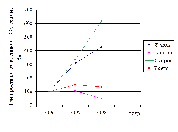 Самым ритмичным производством в 1998 году оказалось производство фенола. Стирол тоже показал очень хороший результат, немного уступив фенол. А вот ацетон оказался самым неритмичным продуктом, хотя в предыдущее годы занимал первое место по выпуску продукции.