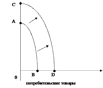 Эта кривая наилучшим образом отражает максимальное количество вариантов разнообразной продукции, которая может быть произведена при данном количестве и качестве природных, трудовых ресурсов и основного капитала на основе данного технологического потенциала. Усиление позитивного воздействия со стороны любого из факторов предложения (увеличение количества и улучшение качества ресурсов, и технологический прогресс) смещают кривую производственных возможностей вправо, что показано как сдвиг от АВ к CD.