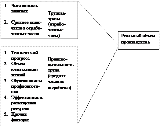 Можно сказать, что реальный ВВП в любое время определяется как трудозатраты (в человеко-часах), умноженные на производительность труда (реальная часовая выработка на одного занятого). Или ВВП = число отработанных человеко-часов * производительность труда.