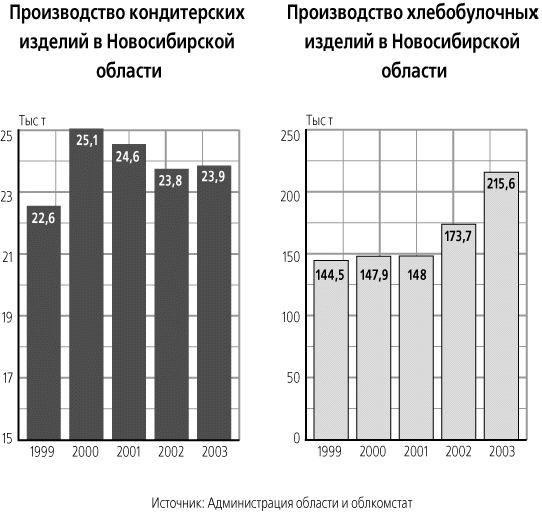По данным компаний, крупнейшими участниками кондитерского рынка в Новосибирске являются шоколадная фабрика “Новосибирская”, “Кондитер”, кондитерское объединение “СладКо”, кондитерский дом “Восток” (Томск). На рынке присутствуют наборы конфет “Покров”, “Коркунов”, “Россия”, “Макро – С”, “Кэдберри”, “Серебряная мечта”, “Сокол”. По собственным данным, доля “Новосибирской” на местном рынке кондитерской продукции составляет 15,4%, доля “Кондитера” – около 12%. Основными производителями хлебобулочных изделий в Новосибирской области являются 5–6 предприятий. По их данным, на долю хлебокомбината “Восход” приходится 30–35% рынка, на “Новосибхлеб” – 25–28%, на хлебокомбинат “Русич” – 17–18%, на хлебокомбинат “Инской” – 10–15%, еще около 5% – на “Бердский хлебокомбинат”.