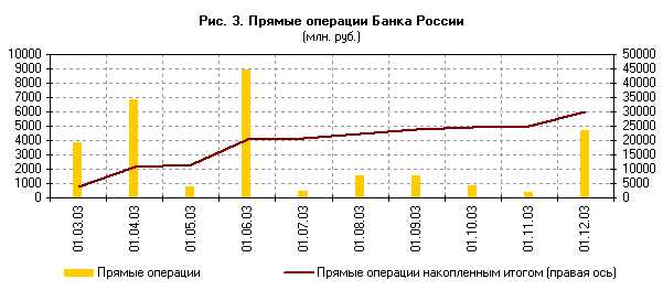 В целом в 2003 г. при проведении комплекса стерилизационных мероприятий приоритет отдавался операциям, обеспечивающим среднесрочное привлечение денежных средств на возвратной основе (депозитные аукционы и продажа ОФЗ с обязательством обратного выкупа), тогда как прямые операции рассматривались в качестве дополнительного способа изъятия свободной ликвидности в условиях повышенного спроса на финансовые активы, номинированные в рублях.