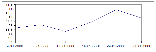 Пессимистичный прогноз. Будет реализован в случае сохранения политико-экономической напряженности, в том числе связанной с затягиванием антитеррористической операции в Чечне и разоблачением фактов коррупции в высших эшелонах власти. Предполагает отсутствие международных кредитов и ухудшение кредитно-денежных показателей. В данном случае объем иностранных вложений в акции уменьшится примерно в два раза (до 1,5 - 2 млрд. долл.), а цены последних понизятся до -50%.