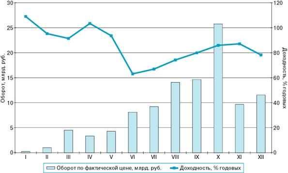 [2][2] В настоящее время действует ограничение на максимальный уровень доходности к погашению на вторичном рынке ГКО-ОФЗ, равное удвоенной ставке рефинансирования Банка России.
