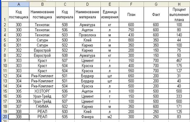 Рис. 1. Расположение таблицы данных отдела снабжения MS Excel.