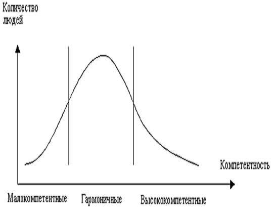 После выделения высококомпетентных и малокомпетентных остается группа гармоничных членов, группа большинства, "обыкновенные". Это участники группы, обладающие средним запасом компетентности и отдающие этот запас на реализацию целей фирмы. Для них характерно стремление к успеху, но им не нужна победа любой ценой, особенно за их счет. Они неспособны пожертвовать собой, хотя и будут упорно добиваться поставленных целей. Это основная масса группы, которая в спокойном состоянии может делиться на мелкие группировки, объединенные более тесным дружеским контактом, но в экстремальных условиях она превращается в агрессивный монолит, способный противостоять любым внешним обстоятельствам и достигать любых целей[1,с . 189].