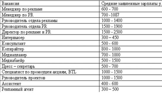 На рынке труда за последний год прослеживаются две основных тенденции: первая — это насыщение рынка ПР- специалистами среднего и низшего звена, а вторая — это нехватка высокопрофессиональных специалистов, которые могли бы занимать пост (табл. 1.3)