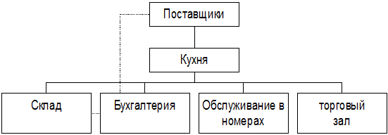 Информация от поставщиков попадает на кухню шеф-повару. Если она касается пополнения склада, то она проходит через бухгалтерию, где поступивший товар оформляется документально. В отдел бухгалтерии поступает также поток финансовой информации о полученной выручке. Из отдела обслуживания в номерах на центральный кухонный терминал поступают заказы от гостей отеля. Также заказы поступают и из торгового зала.