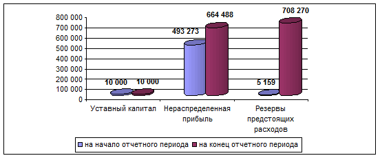 Анализируя структуру собственных средств ООО «Колосок» можно отметить, что собственные средства организации сформированы за счет трех источников: уставного капитала, нераспределенной прибыли и резервов предстоящих расходов (Рис. 3).