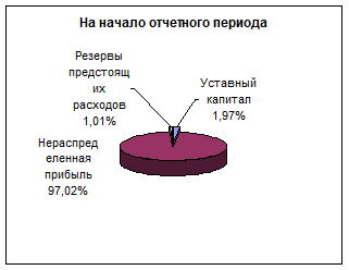 Также можно отметить, что на начало отчетного периода основную долю собственных средств составляла нераспределенная прибыль (97,02%), на конец периода доля прибыли снизилась на 48,96% за счет увеличения доли резервов предстоящих расходов на 50,21% (Рис. 4).