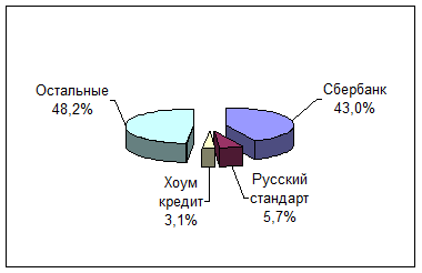 Рынок кредитования физических лиц - один из самых быстрорастущих в сфере банковских услуг. В 2004 году он вырос вдвое с 298 до 617 миллиардов рублей. Лидером по выдаче займов является Сбербанк, на его долю приходится 43 процента займов. Затем идут банки розничного кредитования - "Русский стандарт" (5,7 процента) и "Хоум Кредит энд Финанс Банк" (3,1 процента), заняв, таким образом более 50% рынка кредитования (рис.1)
