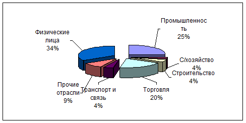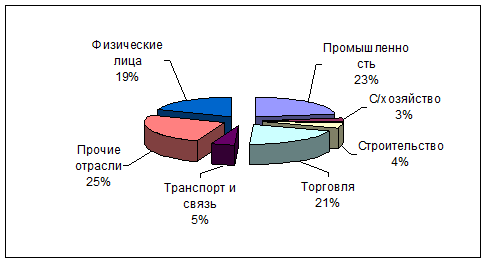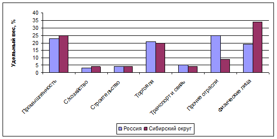 Структура задолженности по кредитам в рублях, предоставленным кредитными организациями юридическим лицам по отраслям экономики и физическим лицам по Сибирскому округу отличается от аналогичной структуры в целом по России. Как видно из рисунка 4, лидируют физические лица, промышленность и торговля.