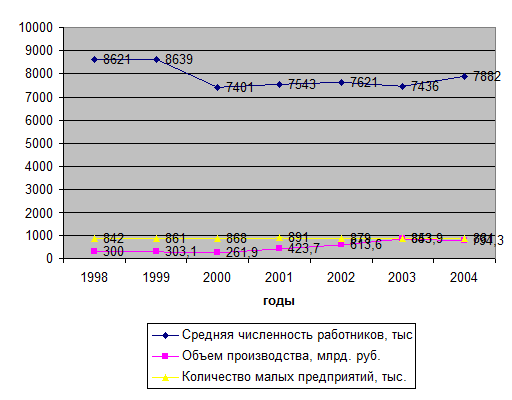 К концу 2004 года на предприятиях России производительность труда существенно выросла по сравнению с 1999 годом с 35,1 до 116,8 тыс. руб. Тенденция роста прибыли непостоянна и характеризуется резким падением до минимума в 2000 году, что связано с несостоятельностью налогового законодательства в этот период в наибольшей степени. Однако после принятия ряда налоговых документов положение предприятий в 2001 году несколько улучшилось, но ненадолго. Средняя численность работников в целом характеризуется тенденцией к снижению с 8621 тыс. чел в 1998 году до 7882 тыс. чел в 2004 году. Объем производства на малых предприятиях растет скачкообразно. В 2000 году (что опять таки было связано с постоянными изменения налогового законодательства и не способствовало развитию малого предпринимательства в России) объем производства был минимален и равен 261,9 млрд. руб., а в 2003 году – максимален и равен 853,9 млрд. руб. тенденция увеличения объемом производства приходится на годы кардинального реформирования налоговой системы в Российской Федерации[7].