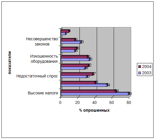 Рис. 1.4. Основные факторы, ограничивающие развитие предприятий в 2003-2004 годах, % опрошенных