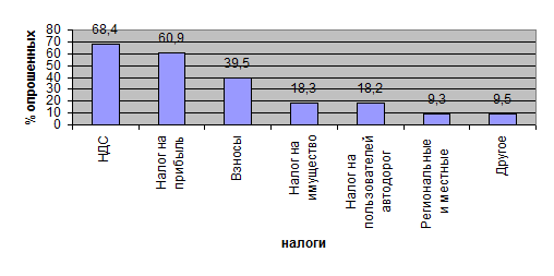 Как видно из рисунка 1.3, наиболее сильными факторами, ограничивающим развитие предпринимательства в России в 2004 году, остаются высокие налоги (64 % опрошенных). Из рисунка 1.4 видно, что среди всех налогов наибольшие трудности для предприятий создает налог на добавленную стоимость (68,4 % всех опрошенных)