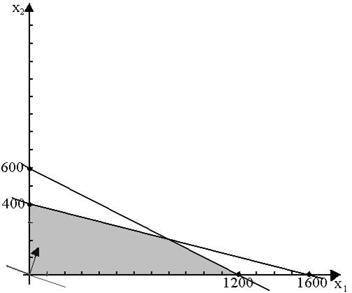 Построим прямые, соответствующие ограничениям задачи: первая прямая имеет вид 0,02х1 + 0,04 х2 = 24, решением ее служат точки (1200;0) и (0;400); вторая прямая имеет вид 0,01х1 + 0,04 х2 = 16, решением ее служат точки (1600;0) и (0;600).