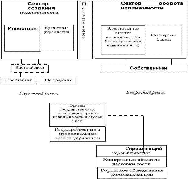 Основными субъектами рынка недвижимости наряду с собственниками и пользователями недвижимого имущества (которыми могут быть и физические, и юридические лица) являются: инвесторы, банки, строительные организации (подрядчики), фирмы-риэлтеры, юридические фирмы, фирмы-оценщики, рекламные агентства, страховые компании, комитеты по управлению имуществом, бюро технической инвентаризации, арбитражный суд, нотариальные конторы, налоговые инспекции. Из них можно выделить институциональных участников: организации, регулирующие градостроительное развитие, землеустройство и землепользование, проектировщики, строители, органы-регистраторы прав недвижимости и сделок с ними, государственные нотариусы. Неинституциональные участники рынка – предприниматели: брокеры, оценщики недвижимости, финансисты (банкиры), управляющие недвижимостью, проектировщики и строители, работающие на коммерческой основе, юристы, страховщики, аналитики рынка недвижимости и финансовые аналитики, информационно-аналитические и другие издания, специализирующиеся на тематике рынка недвижимости. Объекты недвижимости могут быть разделены на[22]: