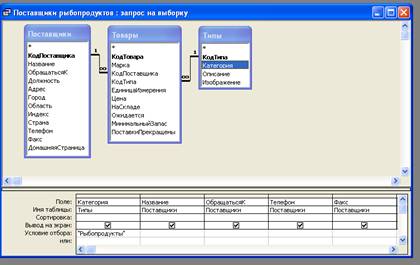 Поскольку сведения о поставщиках хранятся в таблице Поставщики, сведения о товарах – в таблице Товары, а типы товаров – перечислены в таблице Типы, то в запросе необходимо использовать перечисленные три таблицы, связанные между собой. Таблицы Поставщики и Товары связаны по полю КодПоставщика, а таблицы Товары и Типы по поля КодТипа.