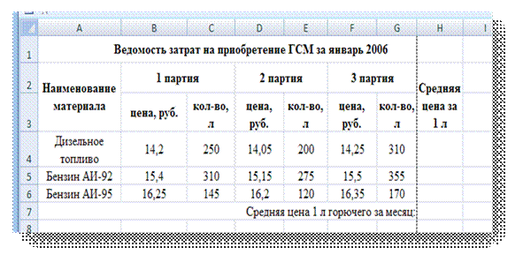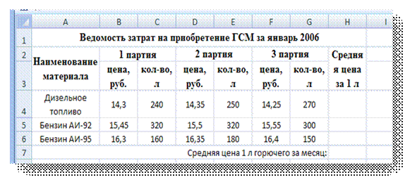 4. На рабочем листе Январь MS Excel создать таблицу ведомости затрат на приобретение ГСМ за январь 2006г.