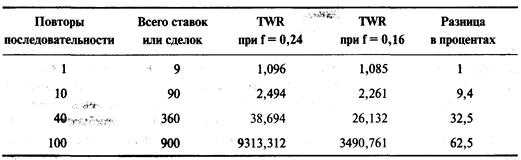 1 Разумный подход требует, чтобы мы использовали наибольший проигрыш, по крайней мере, такой же величины, как и в прошлом. С течением времени мы получаем все большее количество данных и большие периоды проигрышей. Например, если бросить монету 100 раз, она может 12 раз подряд выпасть на обратную сторону. Если бросить ее 1000 раз, то, вероятно, можно получить еще больший период, когда монета выпадет обратной стороной. Тот же принцип работает и в торговле. Мы не только должны ожидать более длинные полосы проигрышных сделок в будущем, следует также ожидать большую проигрышную сделку наихудшего случая.