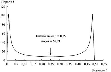 1 Именно в этом случае использование опционов в торговой стратегии столь полезно. Покупка пут или колл-опциона в обратном направлении от позиции по базовому инструменту для ограничения проигрыша либо торговля опционами вместо базового инструмента дадут вам заранее известный максимальный проигрыш, что очень пригодится в управлении деньгами, особенно при оптимальном f. Более того, если вы знаете заранее, каким будет ваш максимальный проигрыш (например, при дневной торговле), тогда вы всегда сможете точно определить величину f в долларах для каждой сделки как следующую дробь: риск в долларах на единицу/оптимальное f. Например, дневной трейдер знает, что его оптимальное f =0,4. Его стоп (stop-loss) сегодня на основе 1 единицы равен 900 долларам. Поэтому оптимально торговать 1 единицей на каждые 2250 долларов ($900 / 0,4) на балансе счета.