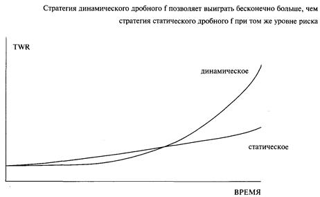 Сняв ограничение по сумме весов и выбрав геометрически оптимальный портфель, мы получим оптимальный портфель с рычагом. Здесь веса и количества отличаются. Разделим оптимальное количество для финансирования одной единицы каждого компонента на его соответствующий вес и получим оптимальный рычаг для каждого компонента портфеля. Теперь разбавим портфель, включив в него безрисковый актив. Можно разбавить портфель до точки, где рычаг как бы исчезает, т.е. рычаг применяется к активной части портфеля, но активный баланс портфеля в действительности использует беспроцентные деньги из неактивной части баланса. Таким образом мы получим портфель, в котором регулируются позиции при изменении баланса счета, что позволяет получить наибольший геометрический рост. Предложенный метод максимизирует отношение потенциального геометрического роста к потенциальному проигрышу и допускает заранее известный максимальный проигрыш. Для управления портфелем ценных бумаг описанный метод является наилучшим. Наиболее распространенный в настоящее время метод выведения эффективной границы в действительности не позволяет получить эффективную границу и, тем более, геометрический оптимальный портфель (геометрический оптимальный портфель всегда находится на эффективной границе), который можно найти только с помощью оптимального f. Кроме того, традиционный метод позволяет получить портфель на основе статического f, а не динамического f, которое в асимптотическом смысле предпочтительнее.