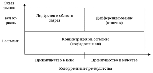 Первая область связана с лидерством в минимизации издержек производства. Вторая область выработки стратегии связана со специализацией в производстве продукции. Третья область определения стратегии относится к фиксации определенного сегмента рынка и концентрации усилий фирмы на выбранном рыночном сегменте. Рассмотрим некоторые наиболее распространенные, выверенные практикой и широко освещенные в литературе стратегии развития бизнеса.
