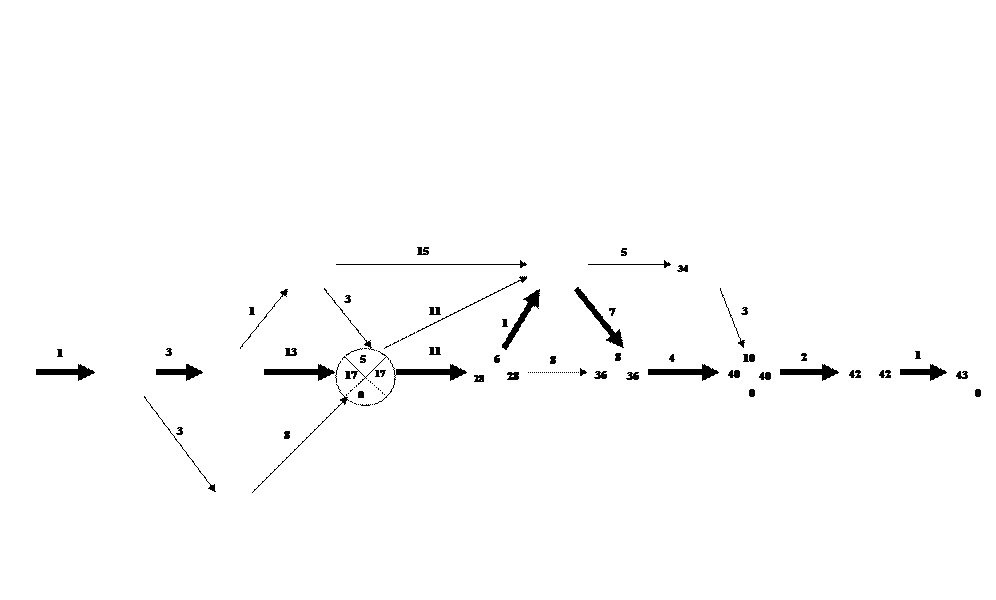 Для определения полного резерва времени работы надо из числа в правом секторе конечного события вычесть число в левом секторе начального события и продолжительность работы между конечным и начальным событиями. Для определения свободного резерва надо из числа в левом секторе конечного события вычесть число в левом секторе начального события и продолжительность работы.