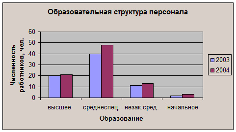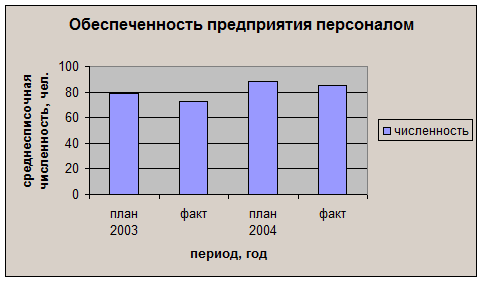 Численность работающих на 01.01.2005г. составляет 85 человек, в т. ч. 6 проходящих производственную практику. Обеспеченность предприятия персоналом за 2003-2004гг. отражены в таблице 2.1.