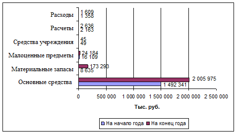 2) Имеется положительная динамика практически всех статей актива баланса за исключением средств учреждения, динамика которых отрицательная и на конец года сумма по этой статье уменьшилась на 4 тыс. руб., произошло это за счет уменьшения суммы денежных средств. По остальным статьям на конец года можно отметить значительное увеличение сумм (Рисунок 3.1):